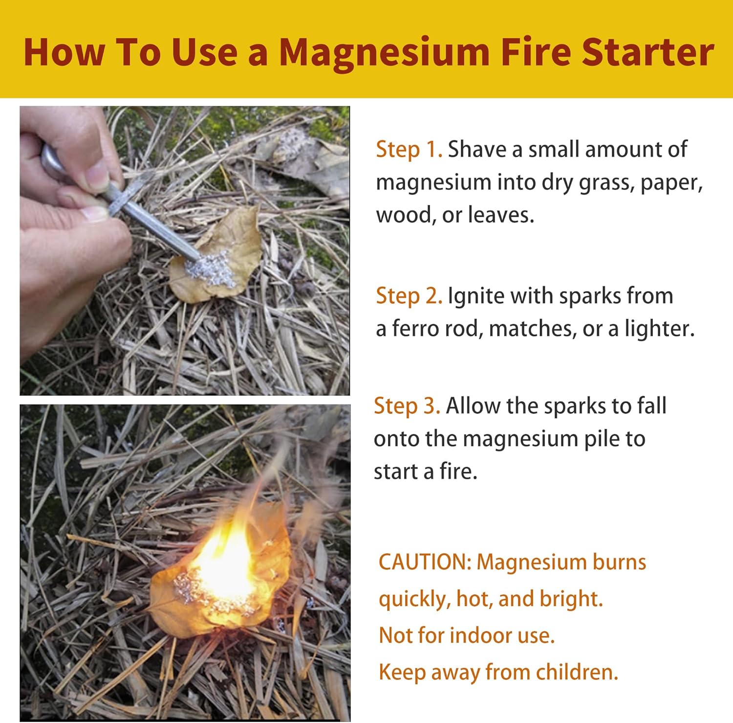 CAUTION: Magnesium burns quickly, hot, and bright. Not for indoor use. Keep away from children.